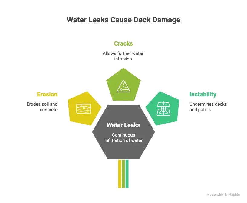 Continuous water leaks infiltrate soil and concrete, eroding substrate and leading to dangerous settlement or major shifts in the deck surface. Surface cracks allow water intrusion, fueling deterioration and creating structural damage over time. Saturated ground can undermine decks, patios, or hardscape installations, posing a safety risk and increasing repair costs.